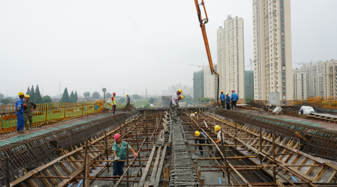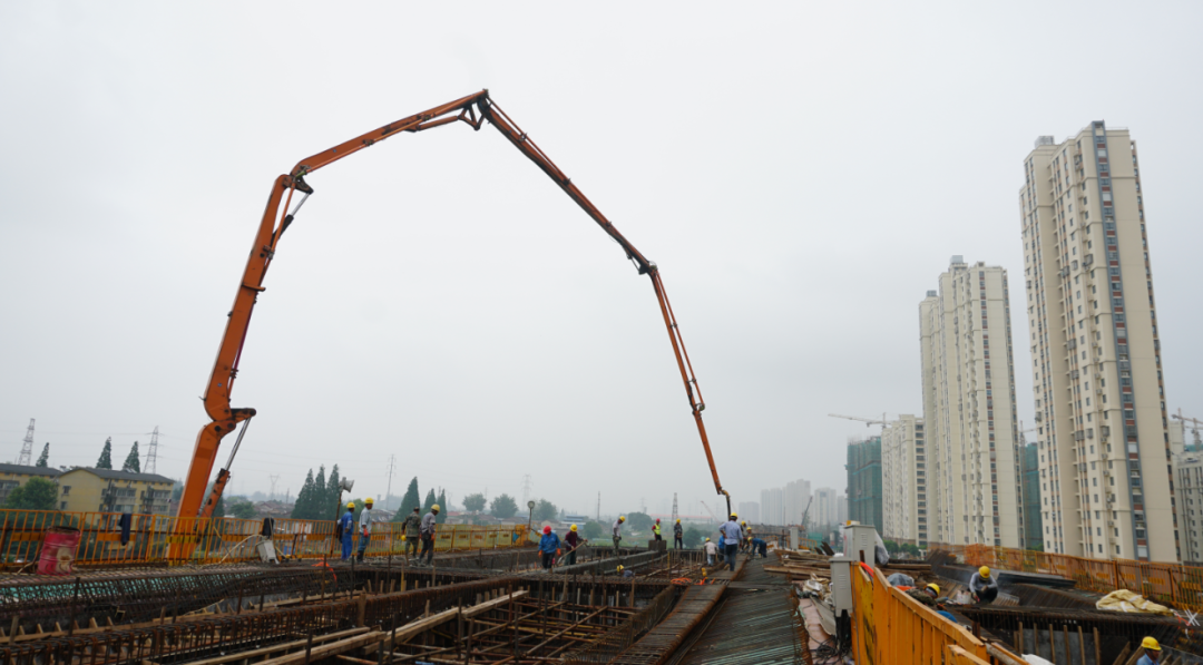 運(yùn)河南北路快速化改造二期工程(萬(wàn)福西路-物港路北)項(xiàng)目包括運(yùn)河路高架橋及萬(wàn)福路互通樞紐,主線(xiàn)全長(zhǎng)2.49公里。其中橋梁全長(zhǎng)5135.753米,包含運(yùn)河路主線(xiàn)橋2490.85米、上下匝道橋577.8米、萬(wàn)福路互通匝道橋2067.103米?;ネㄔ训婪譃?/span>A、B、C、D四條匝道,是連接萬(wàn)??焖俾泛瓦\(yùn)河路的交通樞紐,此次澆筑的箱梁底腹板為A匝道首聯(lián),共計(jì)澆筑混凝土300多方。