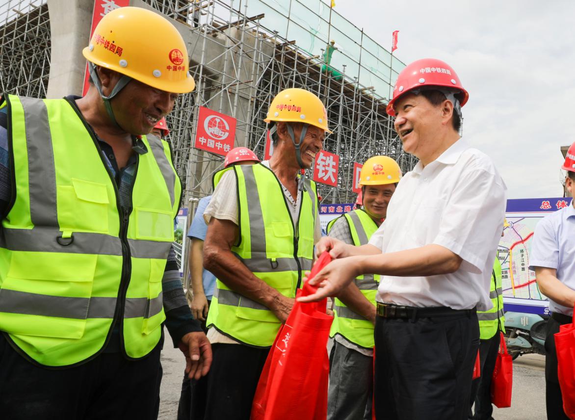 8月6日上午,市人大常委會副主任、市總工會主席楊正福一行來到運(yùn)河南北路快速化改造工程施工現(xiàn)場,看望慰問奮戰(zhàn)在重點(diǎn)工程施工一線的建設(shè)者們,拉開了揚(yáng)州市總工會以“清涼一夏‘送安康’、聚力奪取‘雙勝利’”為主題的夏季安康“三送”(送清涼、送安全、送法律)活動序幕。城控集團(tuán)黨委書記、董事長葉善祥,市總工會副主席韓士軍,城控集團(tuán)副總經(jīng)理季紅軍參加活動。
