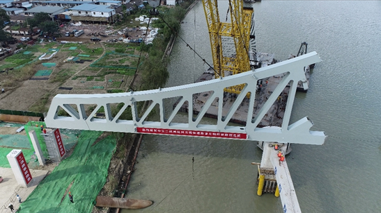 鋼桁架安裝是大橋整個(gè)施工過(guò)程中施工難度最大、技術(shù)要求最高的環(huán)節(jié),項(xiàng)目部從構(gòu)件進(jìn)場(chǎng)、吊裝、精準(zhǔn)定位,每一道工序、環(huán)節(jié)都實(shí)行全過(guò)程、無(wú)縫隙的標(biāo)準(zhǔn)化管理,全力確保安裝和細(xì)節(jié)滿足技術(shù)要求。為確保首節(jié)鋼桁架吊裝工作有序開(kāi)展,項(xiàng)目部成立了專項(xiàng)施工領(lǐng)導(dǎo)小組,多次組織召開(kāi)籌備會(huì)并進(jìn)行吊裝試驗(yàn)。由于吊裝施工是在繁忙的運(yùn)河Ⅱ級(jí)航道,航道運(yùn)輸船舶眾多,為確保航道安全,項(xiàng)目部多次與地方海事協(xié)調(diào),提前發(fā)布封航通告,吊裝過(guò)程實(shí)施水上臨時(shí)交通管制,為安全順利吊裝提供了堅(jiān)實(shí)保障。