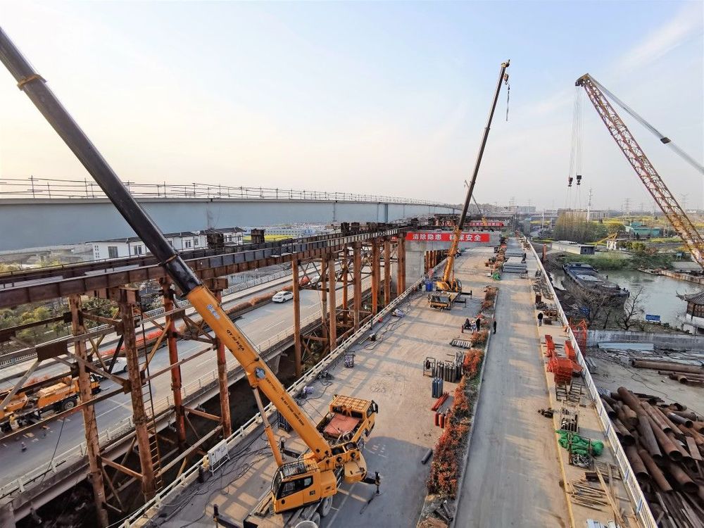 運(yùn)河南北路快速化改造二期工程(萬福西路—物港路北)全線采用高架式快速路斷面,總長(zhǎng)2.73公里,標(biāo)段范圍內(nèi)包含運(yùn)河南北路高架、萬福路互通樞紐和全線地面道路。高架主線橋上部結(jié)構(gòu)大部分采用現(xiàn)澆預(yù)應(yīng)力混凝土連續(xù)箱梁,在運(yùn)河北路與古運(yùn)河交界處,設(shè)計(jì)在原夫差橋上方進(jìn)行施工架設(shè),平行上跨新建230米左右幅三跨連續(xù)鋼箱梁,雙向10車道,是揚(yáng)州快速環(huán)路中唯一一座平行上跨新建的“橋上橋”。其中,鋼箱梁施工采用的是搭設(shè)高空施工平臺(tái),將鋼箱梁吊運(yùn)至平臺(tái)上拼裝,然后頂推到位的方法施工。