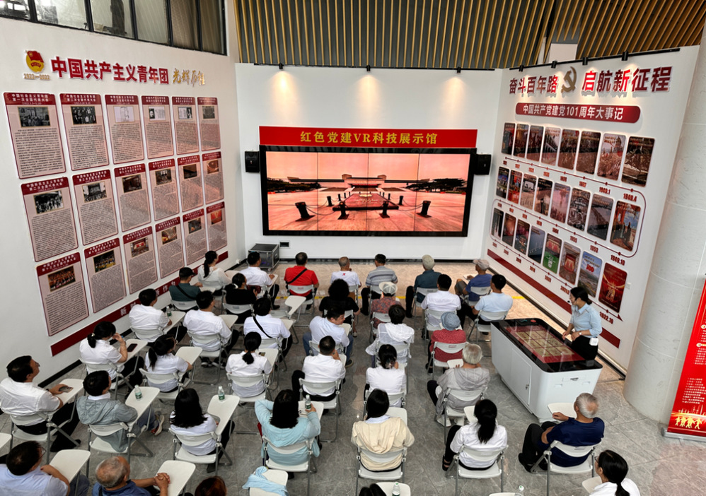在紅色黨建VR科技展示館內(nèi),黨員集中觀看了紅色視頻,并在紅色講壇前重溫入黨誓詞。大家面對鮮紅的黨旗,緊握右拳,莊重地重溫入黨誓詞,進一步堅定了入黨使命和奮斗初心。