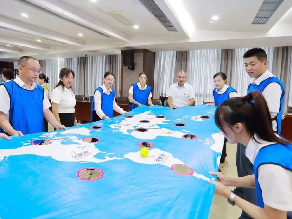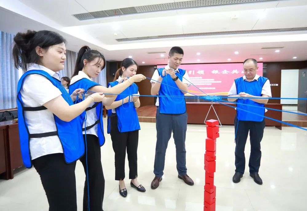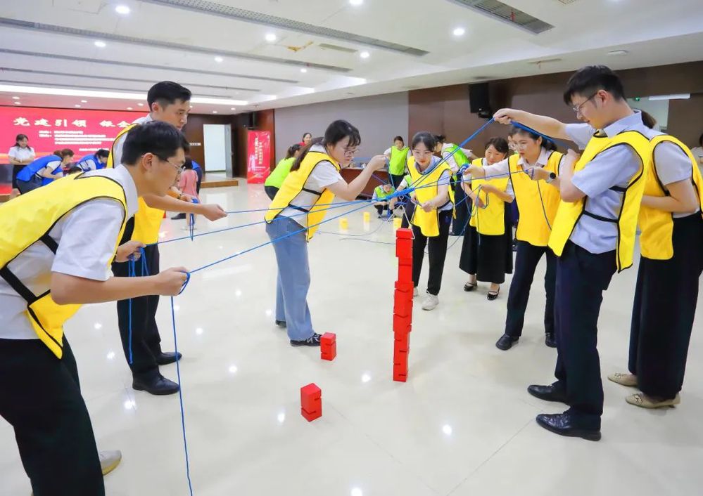此次共建活動在歡快輕松的氛圍中進行,為充分調(diào)動大家的參與熱情,在主持人熱情地引導下,大家首先進行了熱身。熱身活動后,揚州中燃公司和三家銀行組建三支團隊依次開展“環(huán)游世界八十天”、“達芬奇密碼”、“聯(lián)合攻城”等一系列團隊協(xié)作競賽。大家在競賽互動中不斷磨合,增強了彼此之間的信任感和團隊凝聚力。“聯(lián)合攻城”作為競賽環(huán)節(jié)的最后一個項目,將現(xiàn)場的氣氛推到一個高潮?!奥?lián)合攻城”需要隊員們同時操控手中的繩子,利用三角形的鉤子,將現(xiàn)場的八塊積木堆積成一個柱子,堆積過程中手不可觸碰積木,且柱子不倒塌視為完成競賽,用時最少的隊伍獲勝。這項競賽既考驗了隊員們之間的團隊協(xié)作能力,又考驗了每一位隊員的心理素質(zhì)和應(yīng)對能力,大家在團結(jié)緊張活潑的氣氛中感受著充滿挑戰(zhàn)競賽過程和完成項目的喜悅。