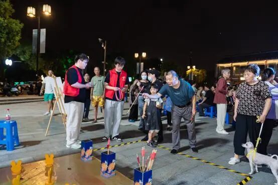 除了文化雅韻,現(xiàn)場(chǎng)設(shè)置了多個(gè)互動(dòng)打卡與市集體驗(yàn)區(qū),讓節(jié)日氛圍更添煙火氣。“我在徐凝遛月亮”打卡點(diǎn)前,居民手持造型精巧的月亮小夜燈定格溫馨瞬間;“玉兔投壺”游戲區(qū)排起長(zhǎng)隊(duì),老少同樂(lè)間復(fù)刻古代士人的閑情雅趣?!霸鹿馐屑眳R集文創(chuàng)手作、中秋美食等,市民憑游園卡完成互動(dòng)、集齊印章,即可兌換月亮小夜燈和冰皮月餅,將節(jié)日祝福化作觸手可及的溫暖。